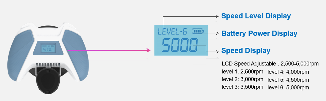 - Speed: 2,500~5,000rpm with LCD display (6 speed levels)