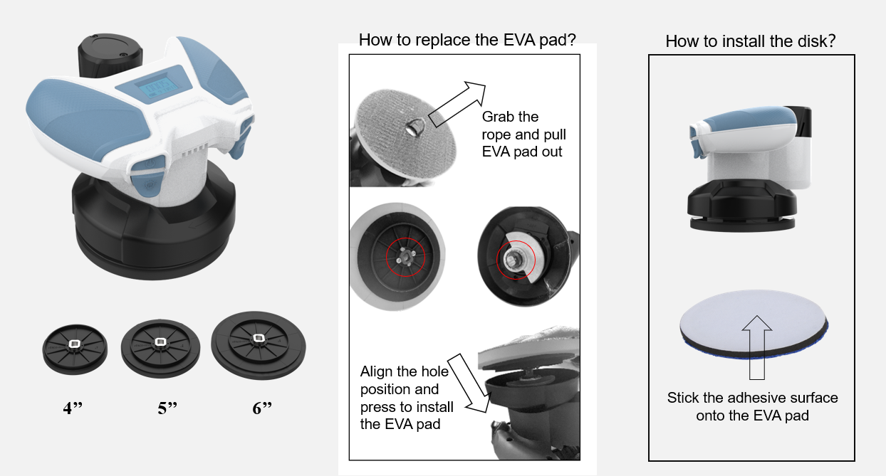 - Unique quick-change disc design. Covenient and quick to change the disc accommodating various sizes of EVA pad.
